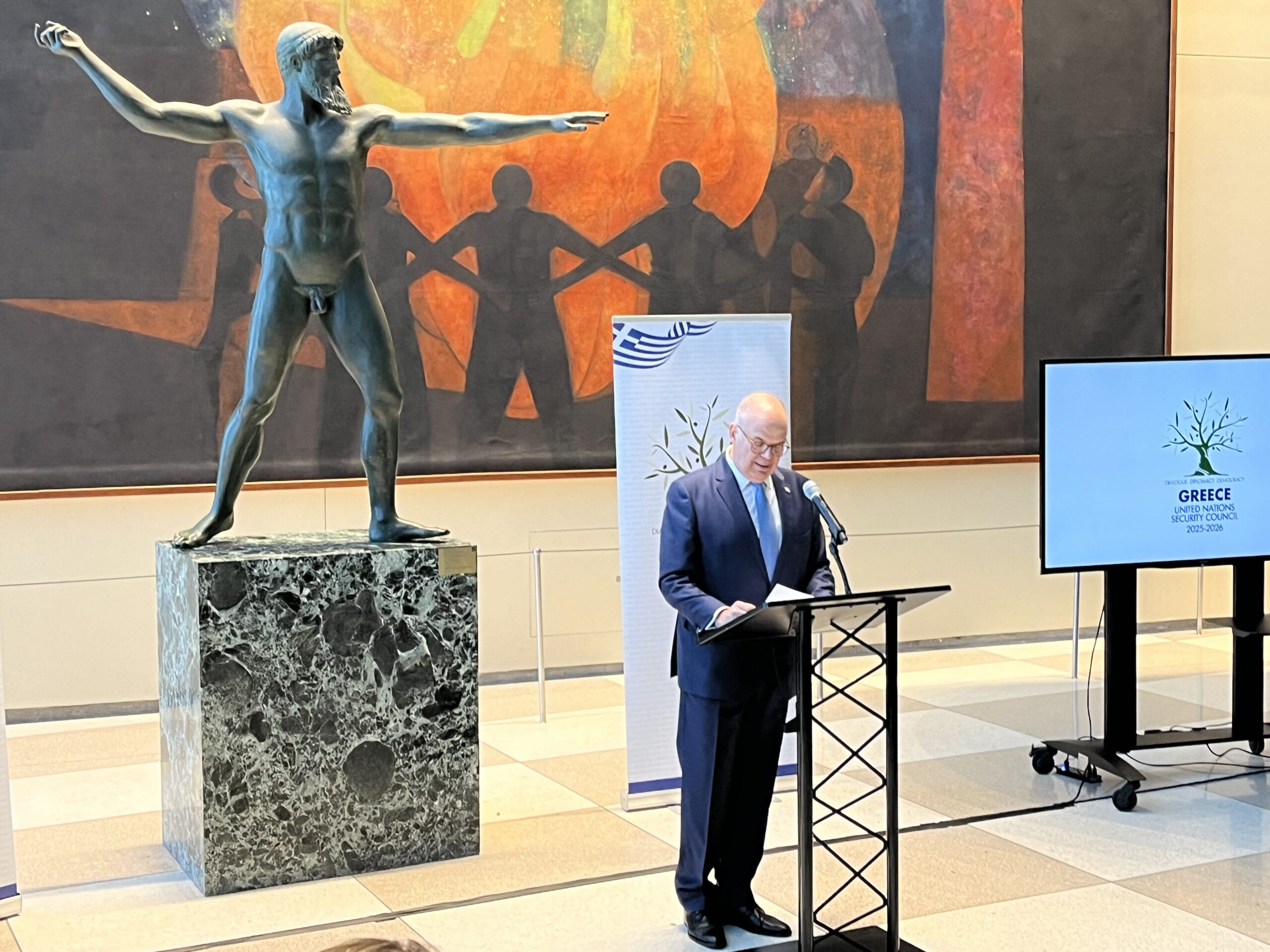 Πέριξ του επιβλητικού αντιγράφου του αγάλματος του Ποσειδώνα του Αρτεμισίου – προσφορά της Ελλάδας στον ΟΗΕ με ευκαιρία την πρώτη θητεία της χώρας μας στο ΣΑΗΕ (1952-1953) – οι προσκεκλημένοι είχαν τη ευκαιρία να μεταφέρουν τις ευχές τους στον Μόνιμο Αντιπρόσωπο, Πρέσβη Ευάγγελο Σέκερη. Ο Πρόεδρος της Γενικής Συνέλευσης, κ. Dennis Francis, στην ομιλία του αναφέρθηκε με θερμά λόγια στην διαχρονική συμβολή της χώρας μας τόσο στην πρόοδο των Ηνωμένων Εθνών, ως ιδρυτικό τους μέλος, όσο και στις κοινές προσπάθειες για την επικράτηση ειρήνης και ασφάλειας στο διεθνές περιβάλλον. Επισημαίνοντας, ιδιαίτερα, τα χαρακτηριστικά που διέπουν τον ελληνικό λαό, όπως το θάρρος και το σθένος, και μιλώντας για τον θρίαμβο και την πρωτοπορία που επιδεικνύει η Ελλάδα από την αρχαιότητα μέχρι και την σύγχρονη εποχή, έκλεισε τον χαιρετισμό του, αναφωνώντας, στα ελληνικά, «Ζήτω η Ελλάς!».