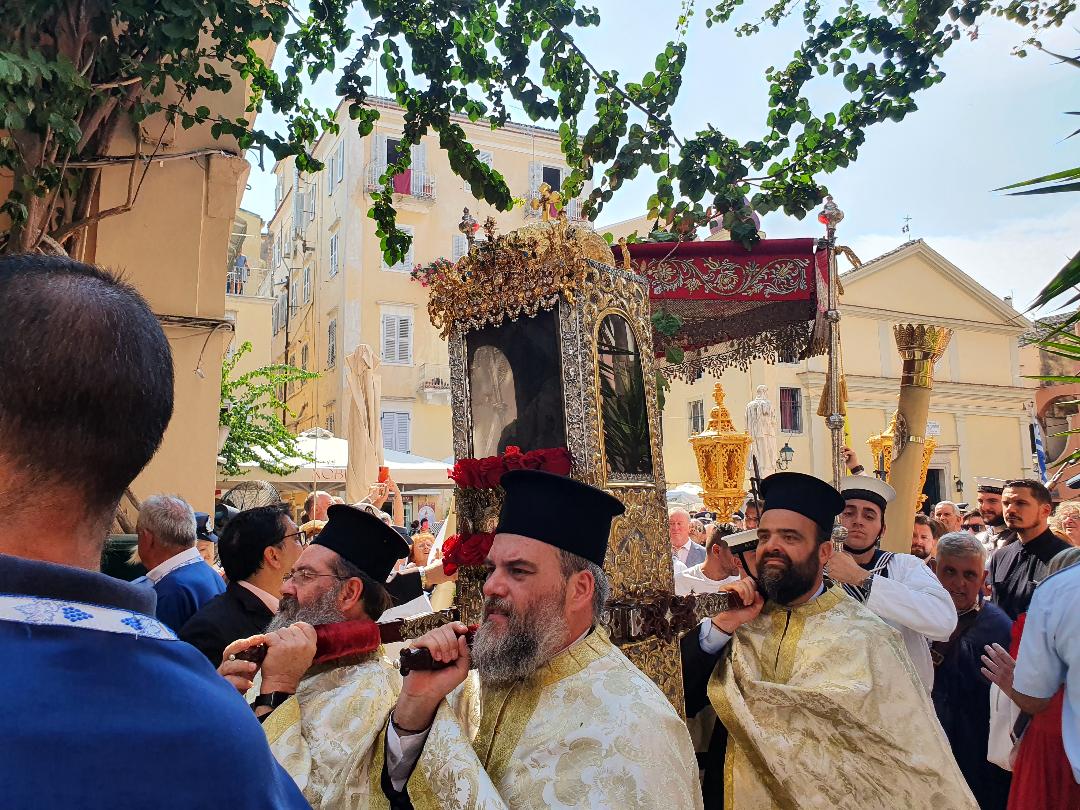 Τη φετινή καλοκαιρινή λιτανεία του ιερού σκηνώματος που διαρκεί περισσότερο από δύο ώρες, ακολούθησαν οι πολιτικές και στρατιωτικές αρχές του τόπου, οι φιλαρμονικές, πρόσκοποι και μαθητές του νησιού, ενώ πρωτοστατούντος του Μητροπολίτη Κερκύρας, Παξών και Διαποντίων Νήσων κ. Νεκταρίου, την ιερά λιτανεία ακολούθησαν και οι: Μητροπολίτης Βεροίας, Ναούσης και Καμπανίας κ. Παντελεήμων, Μητροπολίτης Θεσσαλιώτιδος και Φαναριοφερσάλων κ. Τιμόθεος, Μητροπολίτης Καλαβρύτων και Αιγιαλείας κ. Ιερώνυμος, καθώς και ο Καθολικός Αρχιεπίσκοπος Κέρκυρας, Κεφαλονιάς και Ζακύνθου, Γεώργιος Αλτουβάς.