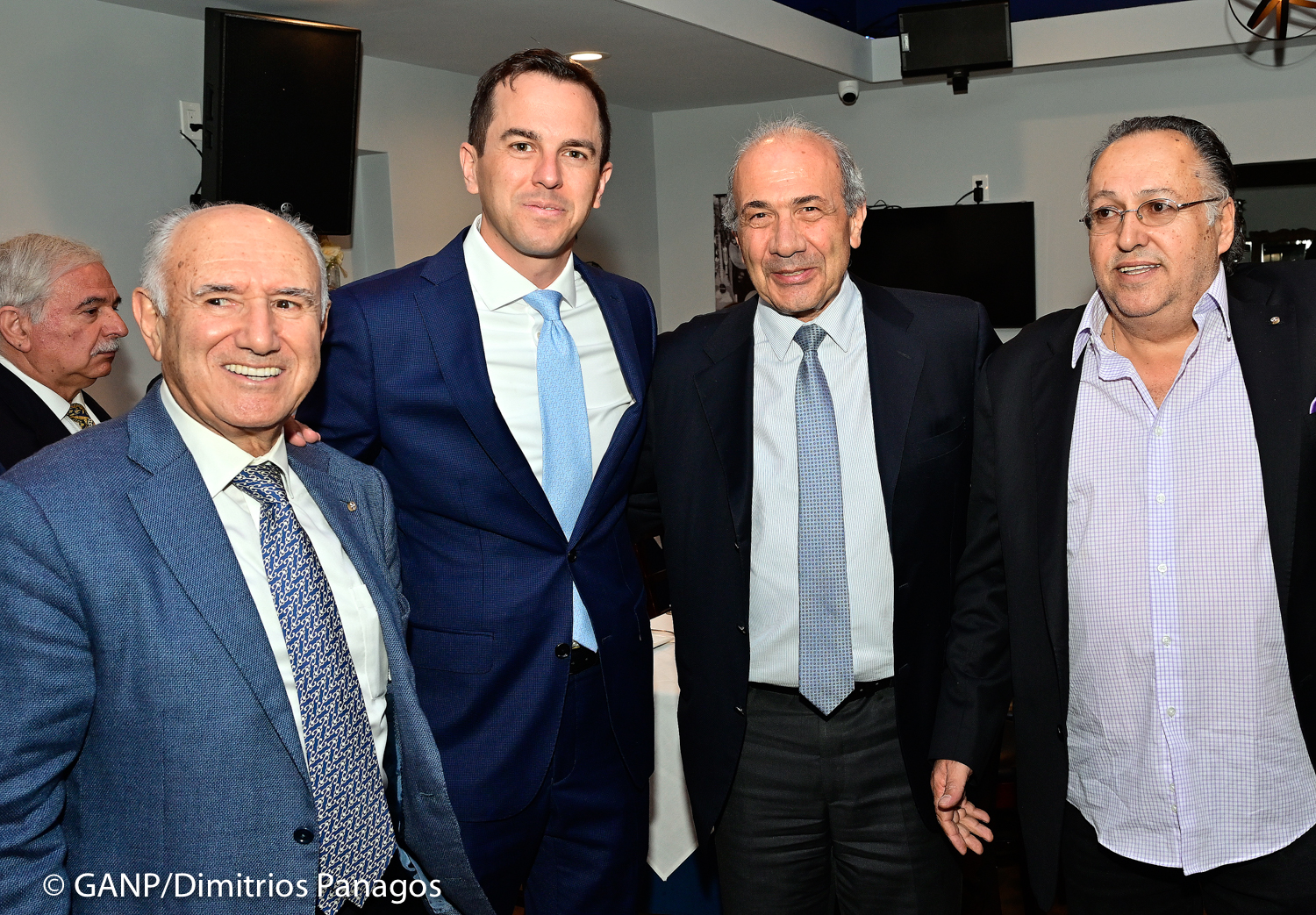 Ο Σάββας Τσίβικος με τους Στηβ Ζερβούδη (2Α), τον Σταύρο Χαβιάρα (2Δ) και ομογενείς στην εκδήλωση οικονομικής υποστήριξης της προεκλογικής εκστρατείας της Νικόλ Μαλλιωτάκη
