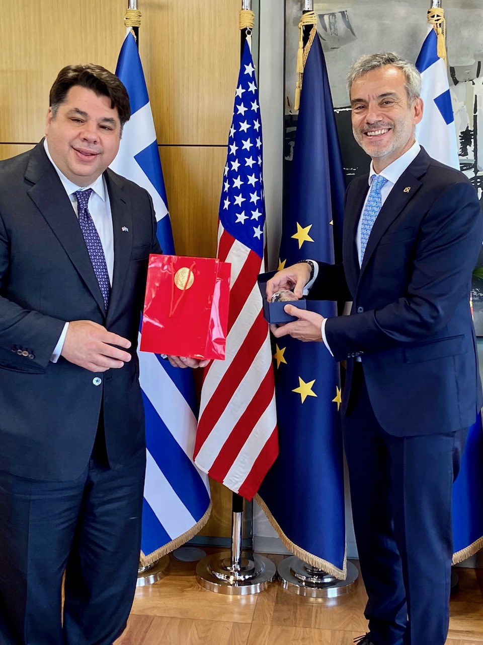 Ο κ. Ζέρβας χάρισε στον Αμερικανό πρέσβη ένα ζευγάρι μανικετόκουμπα με τον θυρεό του Δήμου Θεσσαλονίκης.