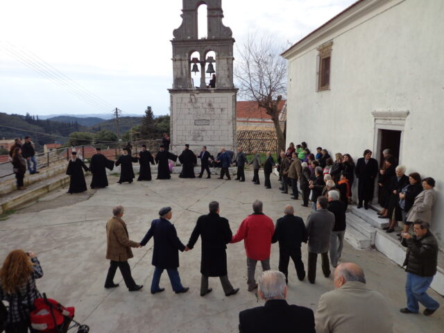 «Δεν ξέρουμε πότε ακριβώς ξεκίνησε. Κατά παράδοση, εμείς το συνεχίζουμε. Δίνουμε συνέχεια κάθε χρόνο. Μεταλαμπαδεύουμε το χορό κι εμείς, στα παιδιά μας». Ο επίτροπος μάς μεταφέρει τη δική του παιδική μνήμη, σχετικά με το έθιμο και την τελετουργία του τις παλαιότερες εποχές. Όπως λέει, πριν από δεκαετίες, όταν το χωριό είχε δύο ενορίες, ο εσπερινός της συγχώρεσης γινόταν και στους δύο ιερούς ναούς. Αμέσως μετά, όλοι μαζεύονταν στο προαύλιο του Αγίου Βασιλείου, όπου είναι και η πλατεία του χωριού, ο «φόρος» όπως την αποκαλούν, αντάλλασσαν φιλιά και αμέσως μετά, ξεκινούσε ο χορός, με πρώτο χορευτή τον γηραιότερο ιερέα.