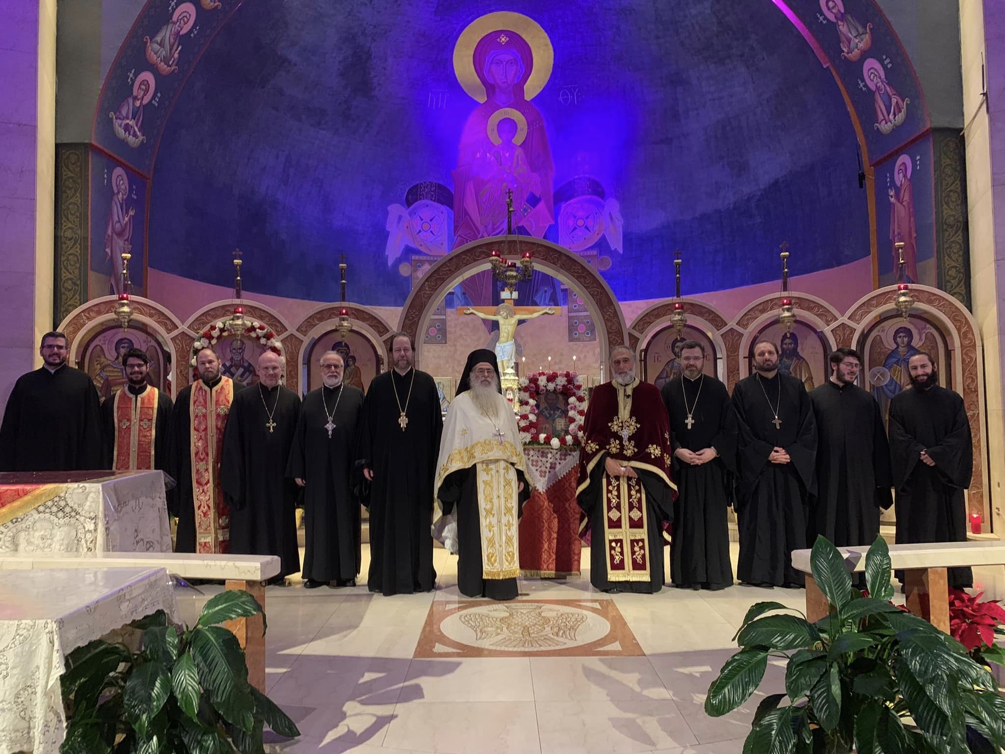 Ο Επίσκοπος Ναζιανζού κ. Αθηναγόρας, Αρχιγραμματέας της Ιεράς Επαρχιακής Συνόδου της Αρχιεπισκοπής Αμερικής, προεξήρχε της Αρχιερατικής Θείας Λειτουργίας μετ’ Αρτοκλασίας στον πανηγυρίζοντα Ιερό Ναό το πρωί της Τετάρτης 6 Δεκεμβρίου. Συλλειτούργησαν ο Αρχιμανδρίτης Ιερόθεος Μαρκόπουλος, ο ιερατικώς προϊστάμενος της κοινότητας π. Παύλος Παλεστίδης, ο π. Αριστείδης Γαρίνης, ο π. Αλέξανδρος Δούβρης και ο Διάκονος Πέτρος Γκόμες.