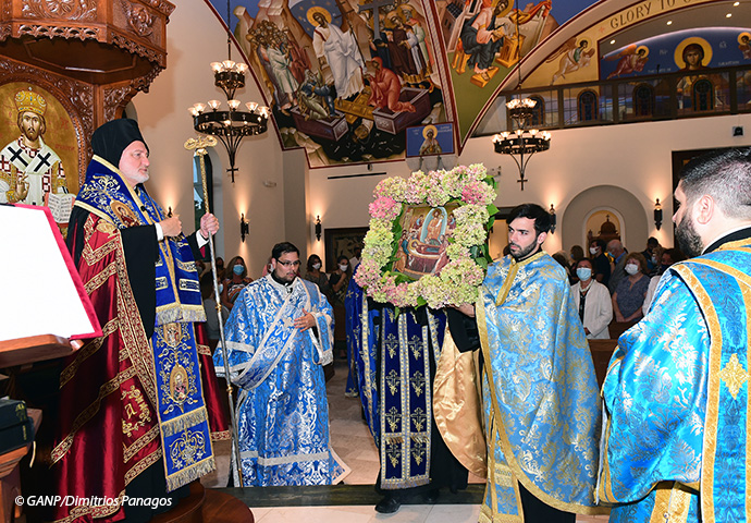 Στον πανηγυρίζοντα Ιερό Ναό της Παναγίας στο Southampton χοροστάτησε το βράδυ του Σαββάτου 14 Αυγούστου κατά τον Μέγα Πανηγυρικό Εσπερινό της μεγάλης θεομητορικής γιορτής της Κοιμήσεως της Θεοτόκου ο Αρχιεπίσκοπος Αμερικής κ. Ελπιδοφόρος, βοηθούμενος από τον Γενικό Αρχιεπισκοπικό Επίτροπο, π. Αλέξανδρο Καρλούτσο και τον π. Κωνσταντίνο Λαζαράκη.