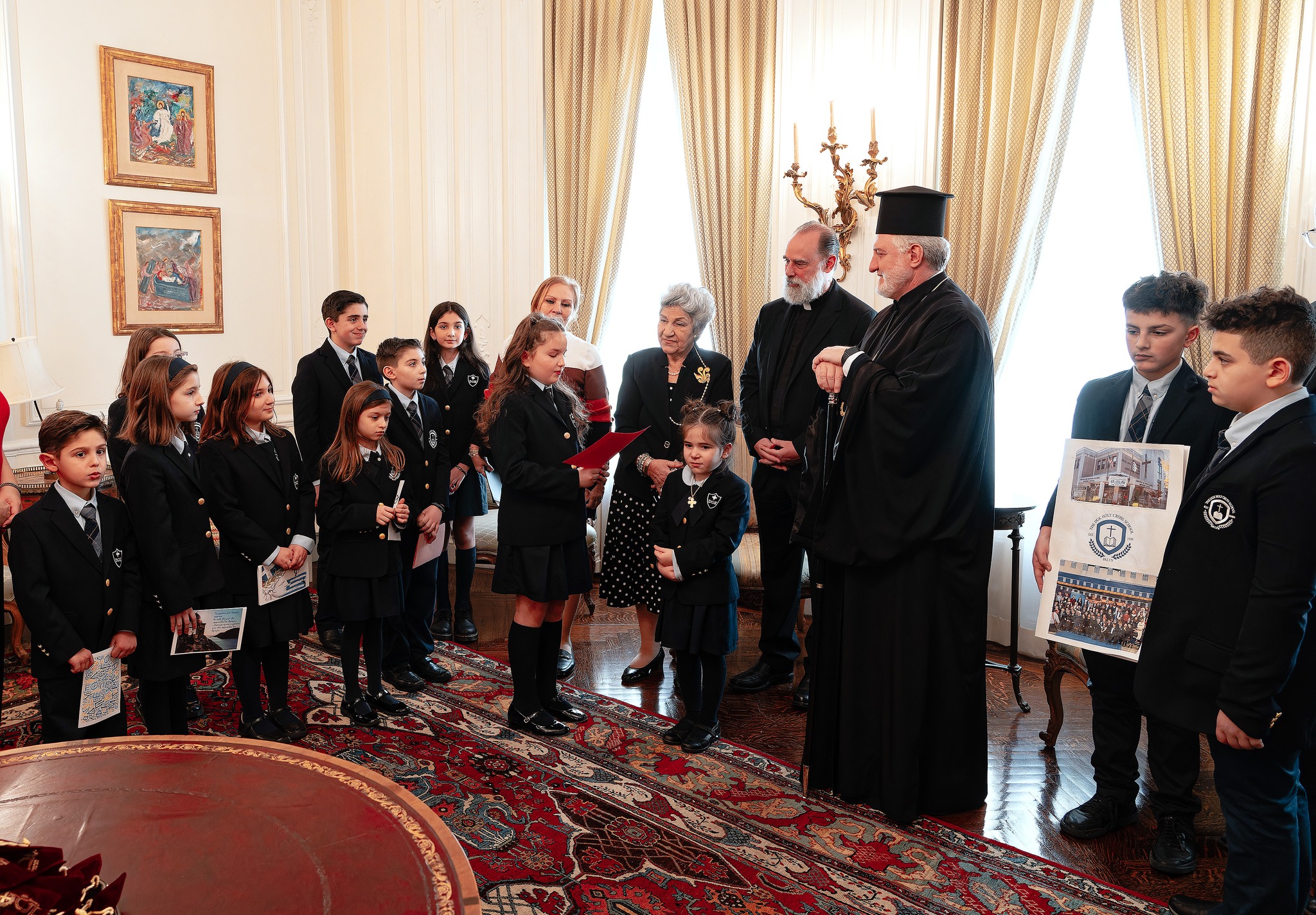 Συνοδευόμενοι από δασκάλους και γονείς, μαθητές από τα Ημερήσια Σχολεία “DGK” του Τιμίου Σταυρού στο Μπρούκλυν, “St. Demetrios Prep” του Αγίου Δημητρίου Αστόριας και “The Cathedral School” του Καθεδρικού της Αγίας Τριάδας στο Μανχάτταν, απήγγειλαν ποιήματα και επέδωσαν στο Σεβασμιώτατο κάρτες που οι ίδιοι έφτιαξαν με ζωγραφιές και μηνύματα για την Ημέρα της Ελληνικής Γλώσσας και με την υπόσχεση ότι “θα διατηρήσουν ζωντανή τη γλώσσα, τη θρησκεία και τον πολιτισμό της πατρίδας των παππούδων και των γιαγιάδων τους”.