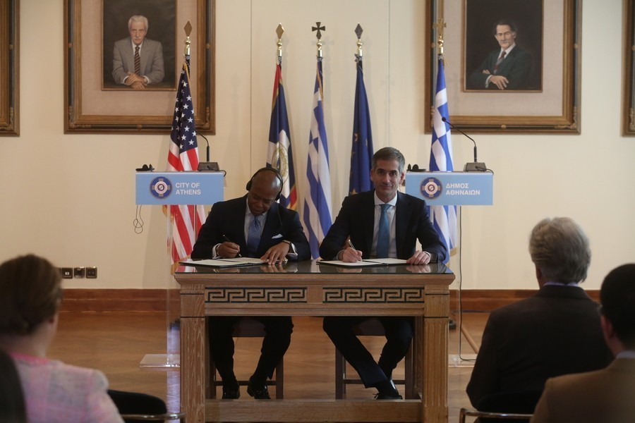 Το σχετικό Μνημόνιο Αδελφοποίησης υπέγραψαν ο Δήμαρχος Αθηναίων, Κώστας Μπακογιάννης και ο Δήμαρχος Νέας Υόρκης, Έρικ Άνταμς, ο οποίος βρίσκεται από χθες στην ελληνική πρωτεύουσα συμμετέχοντας στις εργασίες της 2ης Συνόδου των Δημάρχων για τον Αντισημιτισμό.