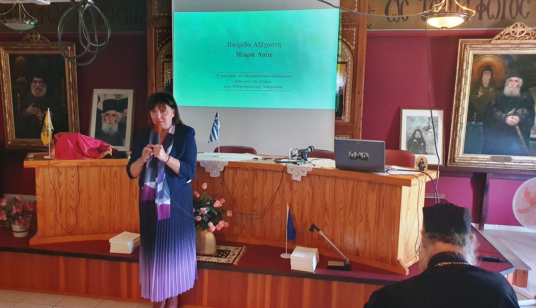 Ο ηγούμενος της Μονής, γέροντας Συνέσιος, καλωσόρισε τον κόσμο που μετά τη Θεία Λειτουργία γέμισε την αίθουσα εκδηλώσεων και μίλησε για τη ζωή και το πλούσιο συγγραφικό έργο της Βασιλικής Ράλλη. Της γυναίκας, που σε ηλικία 70 ετών ξεκίνησε να συγγράφει και μέχρι το θάνατό της σε ηλικία 100 ετών είχε γράψει πάνω από τριάντα βιβλία.