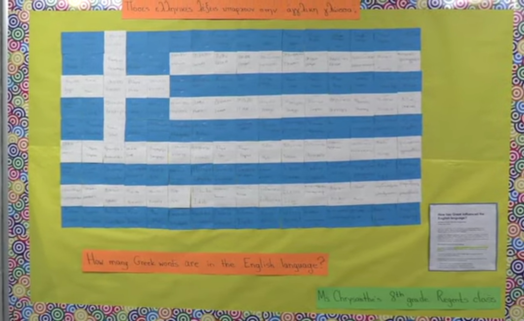 Στη συνέχεια, οι μαθητές και πάλι της 4ης τάξης, συμμετείχαν σε ένα έξυπνο δρώμενο εξηγώντας στη δασκάλα τους την ετυμολογία αγγλικών λέξεων με ελληνική ρίζα, ενώ τα παιδάκια του νηπιαγωγείου κλήθηκαν σε ένα διασκεδαστικό παιχνίδι αναγνώρισης ελληνικών λέξεων στην αγγλική γλώσσα από την καθημερινότητά τους.
