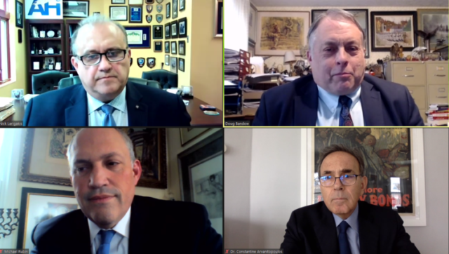The panelists were: Doug Bandow, senior fellow, Cato Institute; Dr. Michael Rubin, a resident scholar at the American Enterprise Institute; and Dr. Constantine Arvanitopoulos, professor and chair of the Karamanlis Hellenic and European Studies Program at the Fletcher School of Law and Diplomacy at Tufts University. AHI President Nick Larigakis served as a moderator for the discussion and facilitated the Q&A.