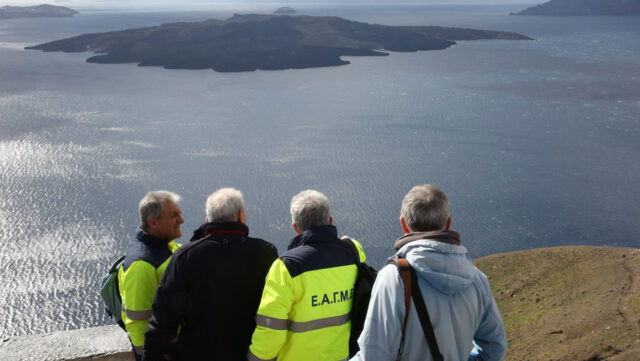Αυτοψία στην Καλντέρα στο ύψος του τελεφερίκ πάνω από το Παλιό Λιμάνι πραγματοποίησε ο πρόεδρος του ΟΑΣΠ και καθηγητής Διαχείρισης Φυσικών Καταστροφών, Ευθύμης Λέκκας μαζί με κλιμάκιο της Ελληνικής Αρχής Γεωλογικών Μεταλλευτικών Ερευνών (ΕΑΓΜΕ).