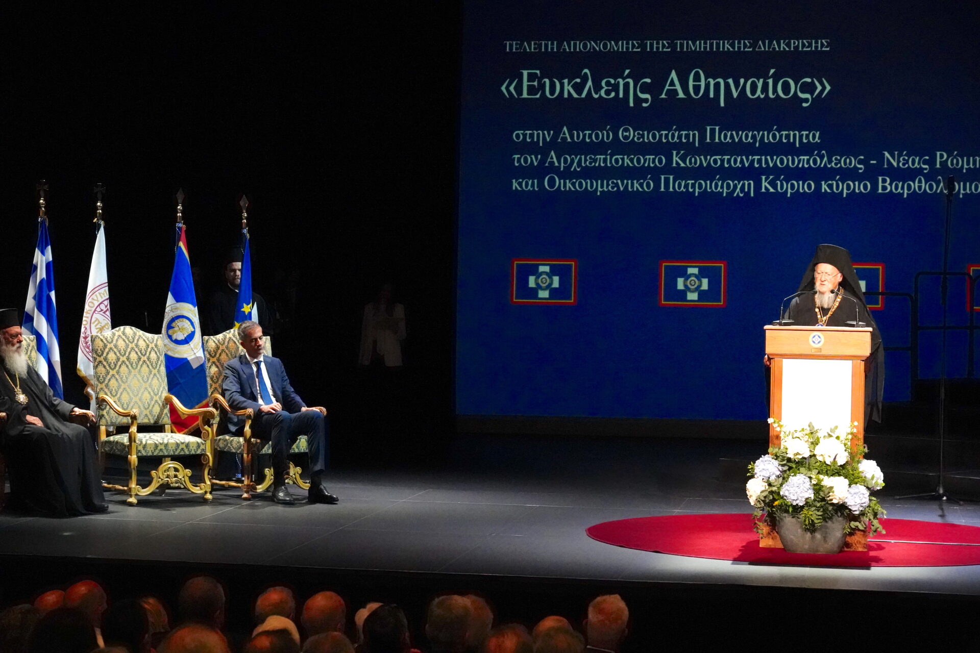 The City of Athens on Saturday bestowed upon Ecumenical Patriarch Bartholomew its highest distinction – the “Efkleis Athineos” or “Illustrious Athenian” award – which was presented by Athens Mayor Kostas Bakoyannis during a ceremony at the Olympia Municipal Music Theatre “Maria Callas” attended by Archbishop of Athens and All Greece Ieronymos.
