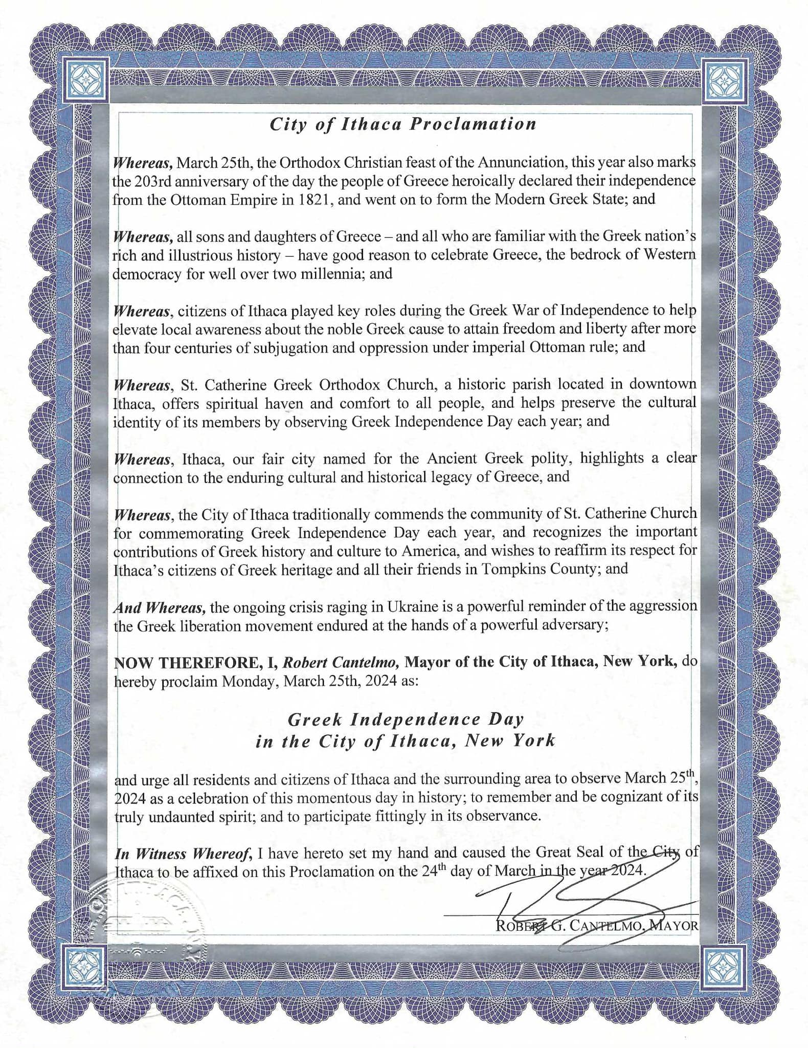 “NOW THEREFORE, I, Robert Cantelmo, Mayor of the City of Ithaca, New York, do hereby proclaim Monday, March 25th, 2024 as: