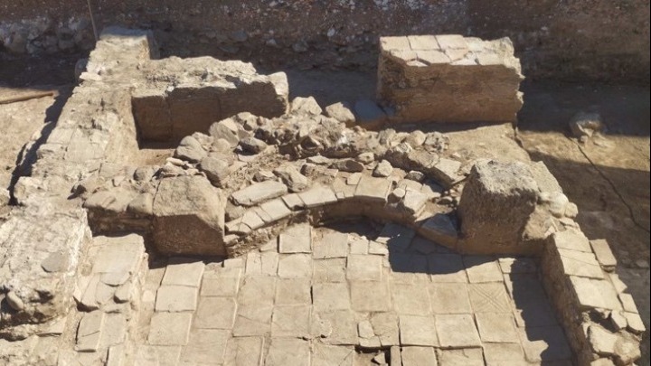 The salvage excavation revealed the foundations of walls forming an apse on the ground plan, with a floor lined with bricks. The walls were constructed of rough stones, roof tiles, and clay, with a thin slip over them. At the apse corners were two large square columns supports, with two stairs in their interior sides.