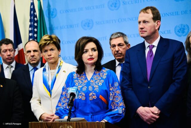 Μιλώντας εκ μέρους της Ουκρανίας και συνολικά 42 χωρών (Αλβανία, Ανδόρα, Αυστραλία, Αυστρία, Βέλγιο, Βοσνία-Ερζεγοβίνη, Βουλγαρία, Καναδάς, Κροατία, Κύπρος, Τσεχία, Δανία, Εσθονία, Φινλανδία, Γαλλία, Γερμανία, Ελλάδα, Ισλανδία, Ιρλανδία, Ιταλία, Ιαπωνία, Λετονία, Λιχτενστάιν, Λιθουανία, Λουξεμβούργο, Μάλτα, Μονακό, Μαυροβούνιο, Ολλανδία, Νορβηγία, Πολωνία, Πορτογαλία, Δημοκρατία της Κορέας, Μολδαβία, Ρουμανία, ‘Αγιος Μαρίνος, Σλοβακία, Σλοβενία, Ισπανία, Σουηδία, Ελβετία, Ηνωμένο Βασίλειο) η αναπληρώτρια υπουργός Εξωτερικών της Ουκρανίας, Μαριάνα Μπέτσα αναφέρθηκε στην 3η επέτειο “από την παράνομη και απρόκλητη πλήρους κλίμακας εισβολή της Ρωσίας στην Ουκρανία”, υπογραμμίζοντας την “ακλόνητη καταδίκη” αυτής της “κατάφωρης παραβίασης του διεθνούς δικαίου”.