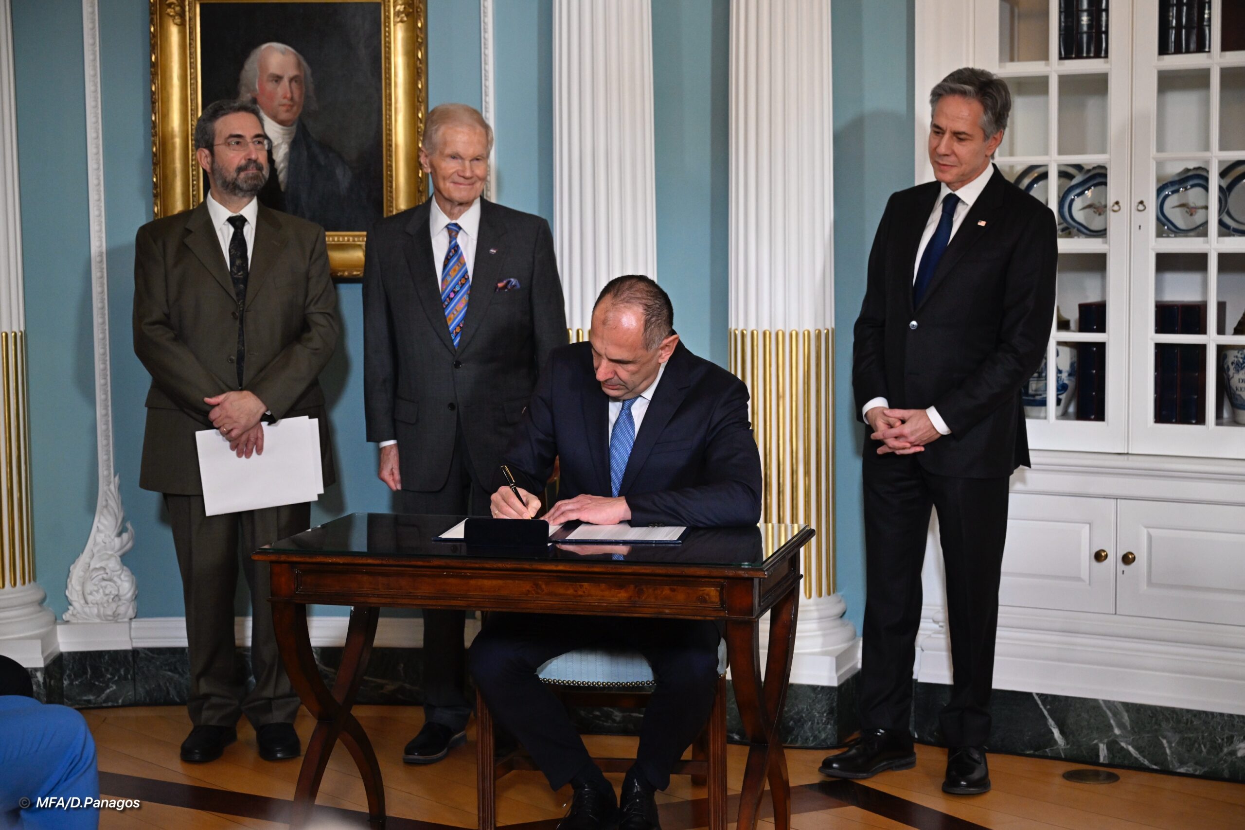 Ο υπουργός Εξωτερικών ‘Αντονι Μπλίνκεν, ο διευθυντής της NASA Μπιλ Νέλσον και ο πρόεδρος του Ελληνικού Κέντρου Διαστήματος Δρ. Ιωάννης Δαγκλής μίλησαν κατά την τελετή της υπογραφής, χαιρετίζοντας τη δέσμευση της Ελλάδας στην ειρηνική, ασφαλή και διαφανή εξερεύνηση του διαστήματος.