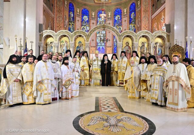 Εκ μέρους του ιερού κλήρου ευχήθηκαν στον Αρχιεπίσκοπο Ελπιδοφόρο ο Πρωτοσύγκελλος της Ιεράς Αρχιεπισκοπής, Επίσκοπος Διοκλείας κ. Νεκτάριος και ο πρόεδρος του Συμβουλίου των Πρεσβυτέρων της Αρχιεπισκοπής, π.Πίτερ Ορφανάκος.