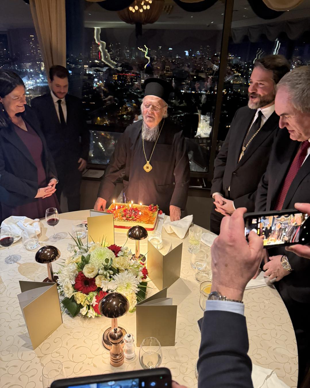 Με τα εξ Αμερικής πνευματικά του παιδιά, τους συμπροσκυνητές του Μητροπολίτη Νέας Ιερσέης κ. Αποστόλου στο «Pilgrimage of Faith» που διοργάνωσε η Μητρόπολη Νέας Ιερσέης στον Αγιον Ορος, τη Θεσσαλονίκη, τα Μετέωρα και την Πόλη, γιόρτασε τα 85 γενέθλιά του ο Οικουμενικός Πατριάρχης Βαρθολομαίος.