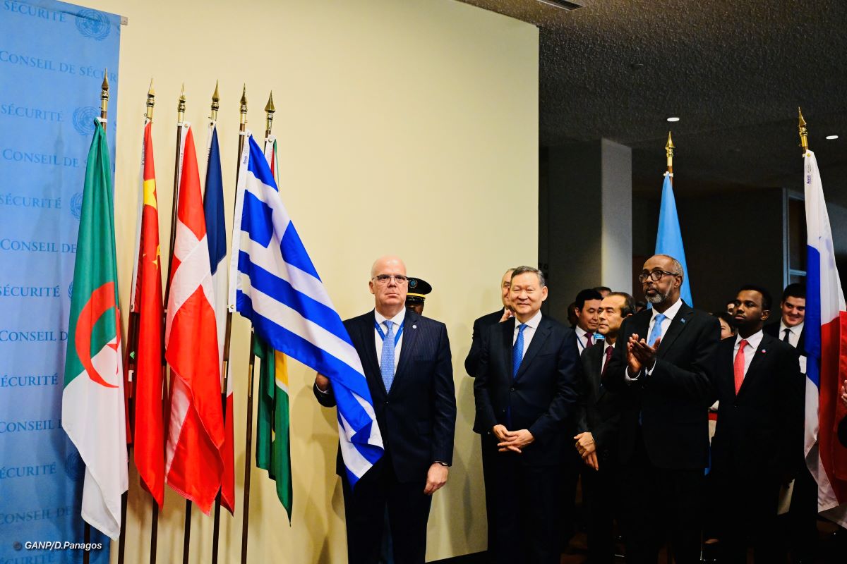 “Με υπερηφάνεια και αίσθημα ευθύνης σε αυτή την όμορφη συμβολική τελετή υψώνεται η σημαία της Ελλάδας, καθώς η χώρα μας αναλαμβάνει σε μια ιδιαίτερη κρίσιμη συγκυρία τη θέση μη μονίμου μέλους του Συμβουλίου Ασφαλείας για την διετία 2025- 2026.