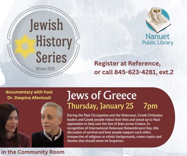 On the occasion of the International Holocaust Remembrance Day, the documentary “Jews of Greece” of “Modern Odyssey” program with Dr. Despina Afentouli that was produced in collaboration with BronxNet will be screened at the Nanuet Public Library (address: 149 Church Street Nanuet, NY 10954) on Thursday, January 25, at 7:00 p.m.