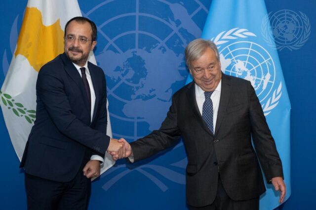 Cyprus President Nikos Christodoulides expressed his readiness to meet “anytime and anywhere” both with the Turkish Cypriot leader and the Turkish delegation, in a bid to resume settlement talks, during a meeting with the UN Secretary-General Antonio Guterres, at the international organization’s headquarters, in New York.