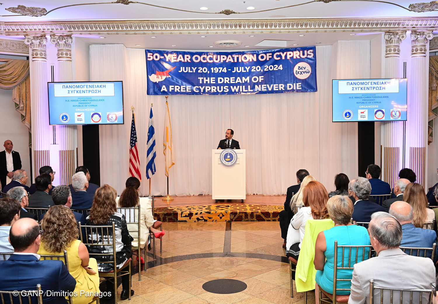 Ακολούθως ο κ. Χριστοδουλίδης μίλησε σε πανομογενειακή εκδήλωση που διοργάνωσαν από κοινού η Ομοσπονδία Κύπρο-Αμερικανικών Οργανώσεων, η ΠΣΕΚΑ, το Κύπρο-Αμερικανικό Εμπορικό Επιμελητήριο και η ΑHEPA, με αφορμή την 50ή μαύρη επέτειο της τουρκικής εισβολής και κατοχής της Κύπρου.