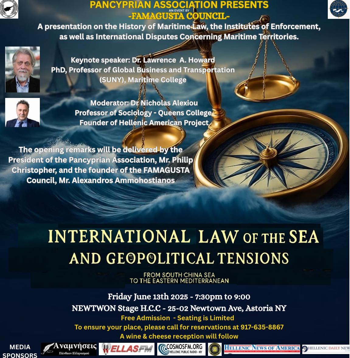 Εκδήλωση – συζήτηση με θέμα «Διεθνές Δίκαιο της Θάλασσας και Γεωπολιτικές Εντάσεις – Γεωπολιτικές εντάσεις που εκτείνονται από τη Νότια Σινική Θάλασσα μέχρι και τη Ανατολική Μεσόγειο», διοργανώνει ο Παγκύπριος Σύνδεσμος Αμερικής σε συνεργασία με τον οργανισμό «Famagusta Council», την Παρασκευής 13 Ιουνίου στις 7:30 μ.μ. στο Newtown Stage tου Ελληνικού Πολιτιστικού Κέντρου στην Αστόρια. [25-02 Newtown Ave, Astoria, N.Y.]