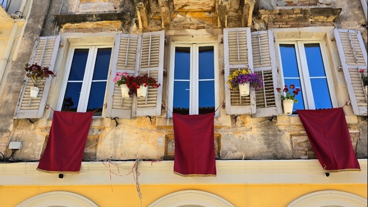 Τα παράθυρα και τα μπαλκόνια των Κερκυραίων σήμερα, Κυριακή των Βαΐων, είναι στολισμένα με τα κόκκινα πορφυρά «δαμάσκο», που προσδίδουν τιμή και επισημότητα στην ημέρα, γιατί πραγματοποιείται, η μεγαλόπρεπη λιτάνευση του Ιερού σκηνώματος του Αγίου Σπυρίδωνα, σε ανάμνηση του θαύματος της απαλλαγής του νησιού , από την πανώλη στις αρχές του 17ου αιώνα.