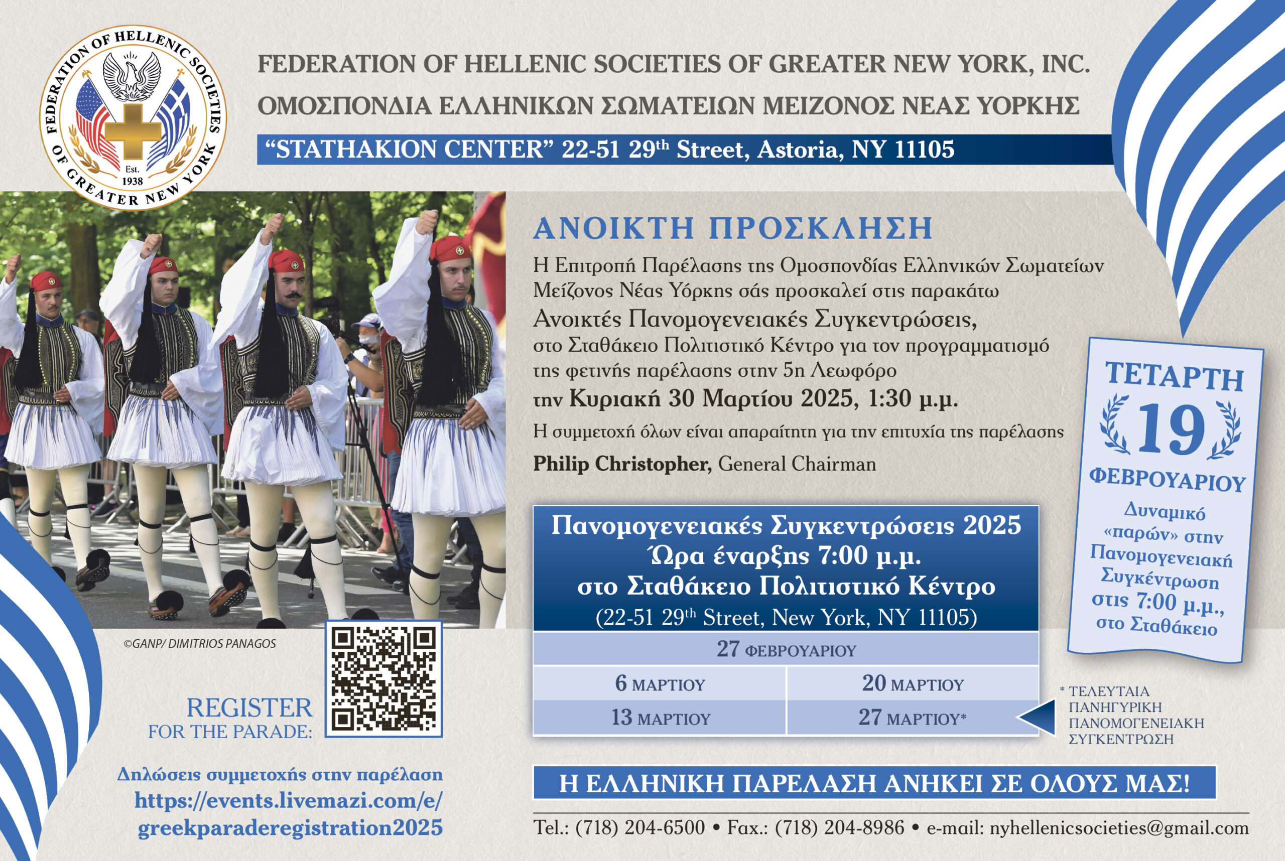 Με την πανομογενειακή συγκέντρωση που θα πραγματοποιηθεί στις 7 το βράδυ της Τετάρτης 19 Φεβρουαρίου και όχι την Πέμπτη -λόγω της Τσικνοπέμπτης- στο Σταθάκειο Κέντρο στην Αστόρια συνεχίζεται η προετοιμασία της εθνικής παρέλασης του Ελληνισμού της Νέας Υόρκης – Νέας Ιερσέης και Κοννέκτικατ στην 5η Λεωφόρο του Μανχάτταν, για την 204 επέτειο της  Ελληνικής Παλιγγενεσίας.